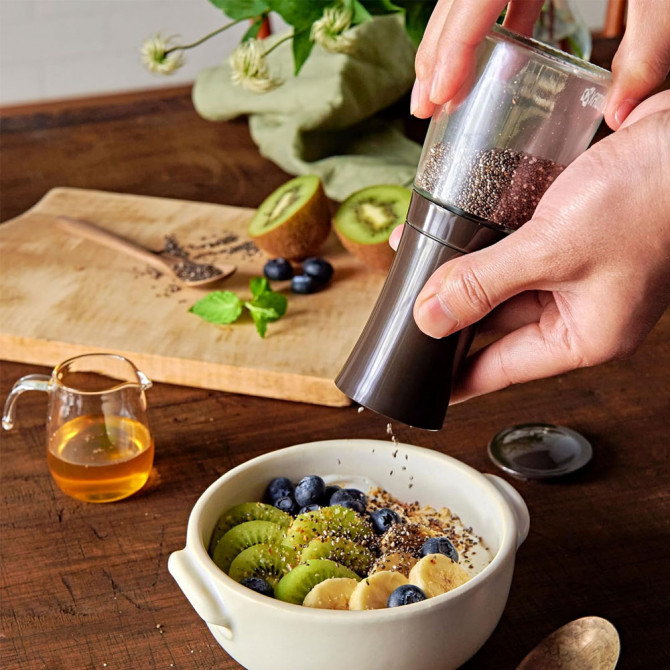 Le moulin à sésame Kyocera vous permet de régler la râpe, plus fine ou plus grossière, grâce à la molette située sur le couvercle. Choisissez le grain qui convient le mieux à votre préparation.