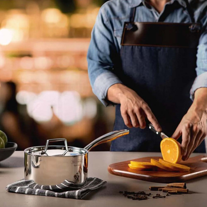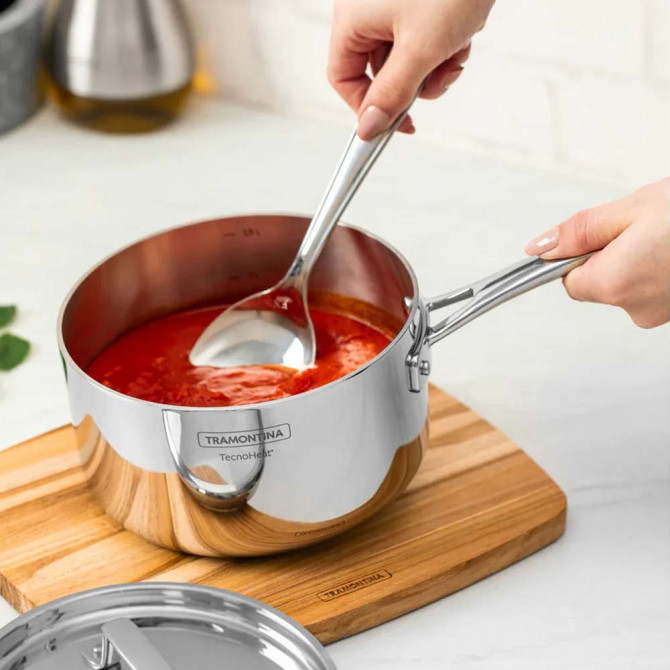 A caçarola pequena Tramontina Grano de 16 cm e 1,70 litros é uma peça essencial para quem valoriza o controlo térmico e a cozinha bem feita. Fabricada com construção Tri-Ply (três camadas: aço inoxidável + núcleo de alumínio + aço inoxidável), oferece uma distribuição de calor rápida e uniforme desde a base até às paredes, evitando pontos frios e melhorando o resultado em cada preparação.