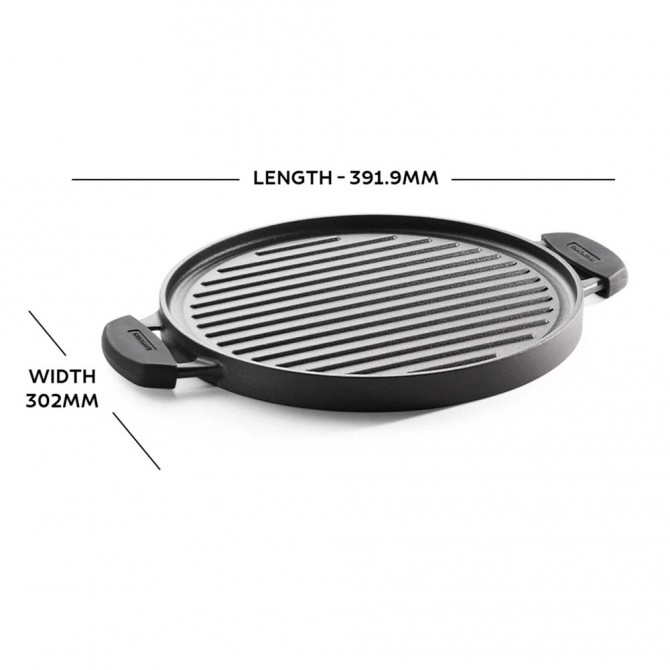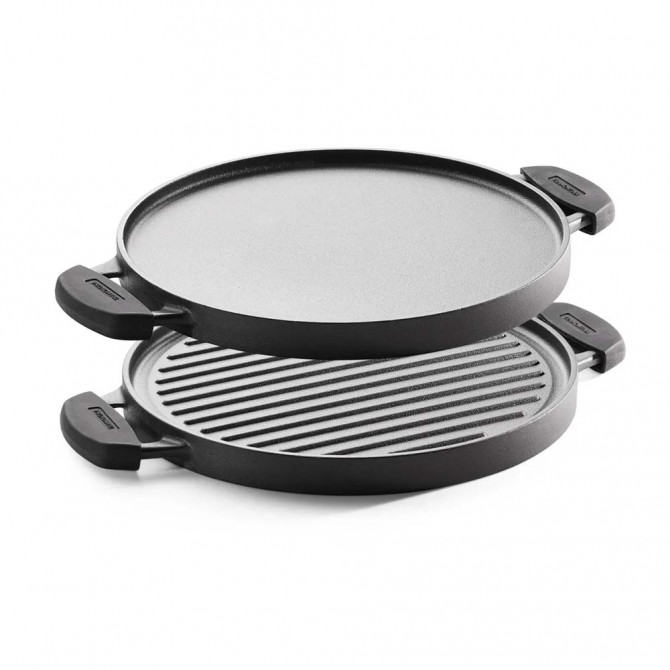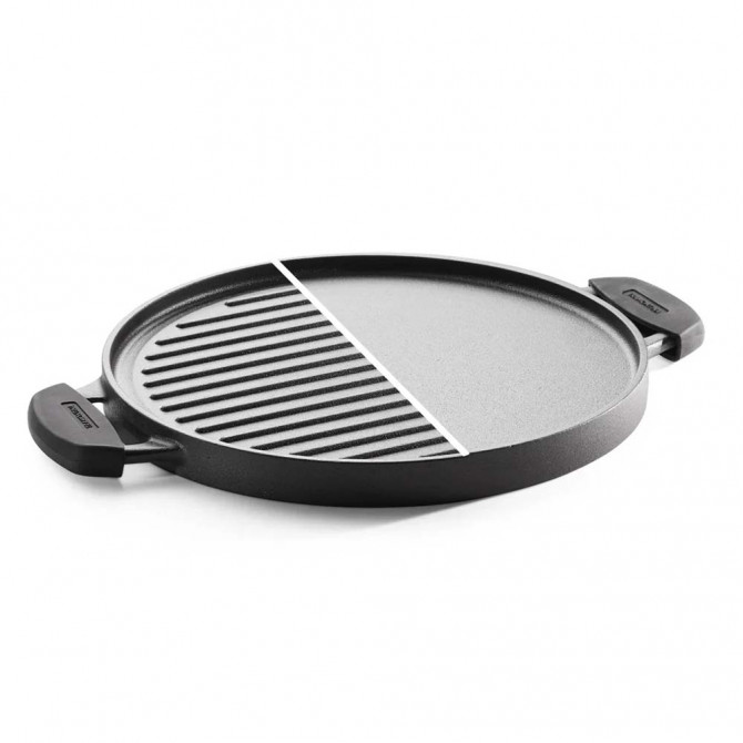 Es una plancha muy adecuada para cocinar carnes a la plancha, verduras salteadas o marcadas, panes planos, tortillas, pancakes, bocadillos calientes y masas finas. La cara lisa funciona especialmente bien cuando interesa una superficie continua y homogénea, mientras que la cara acanalada resulta más útil para sellar y marcar. También es una buena elección para quien quiere una pieza resistente para usar tanto en cocina como en horno o sobre fuego directo.